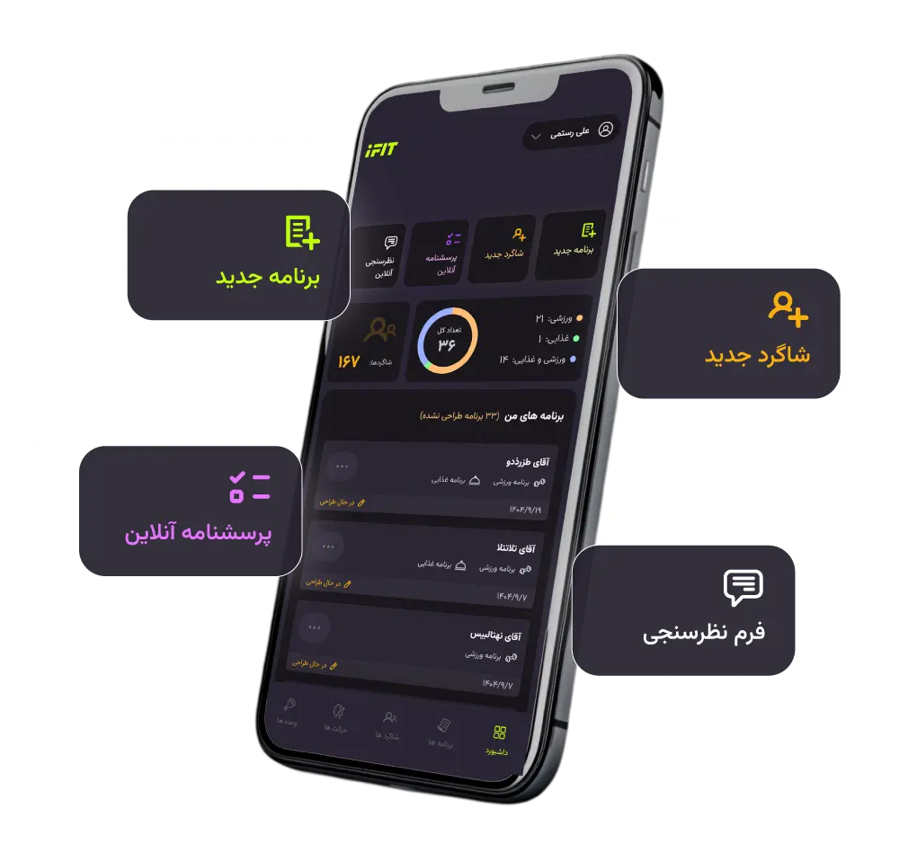 با خودکارسازی کردن کلیه عملیات طراحی برنامه، از پرونده سازی و اندازه گیری شاگرد تا آموزش نحوه اجراء حرکت ها ،آی فیت به شما اجازه میدهد تا شاگرد ها و برنامه های خود را بهتر از همیشه طراحی و مدیریت کنید.